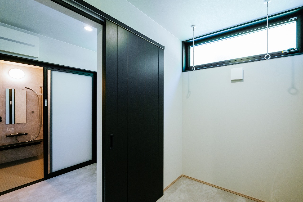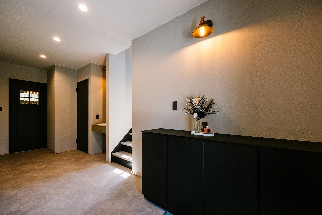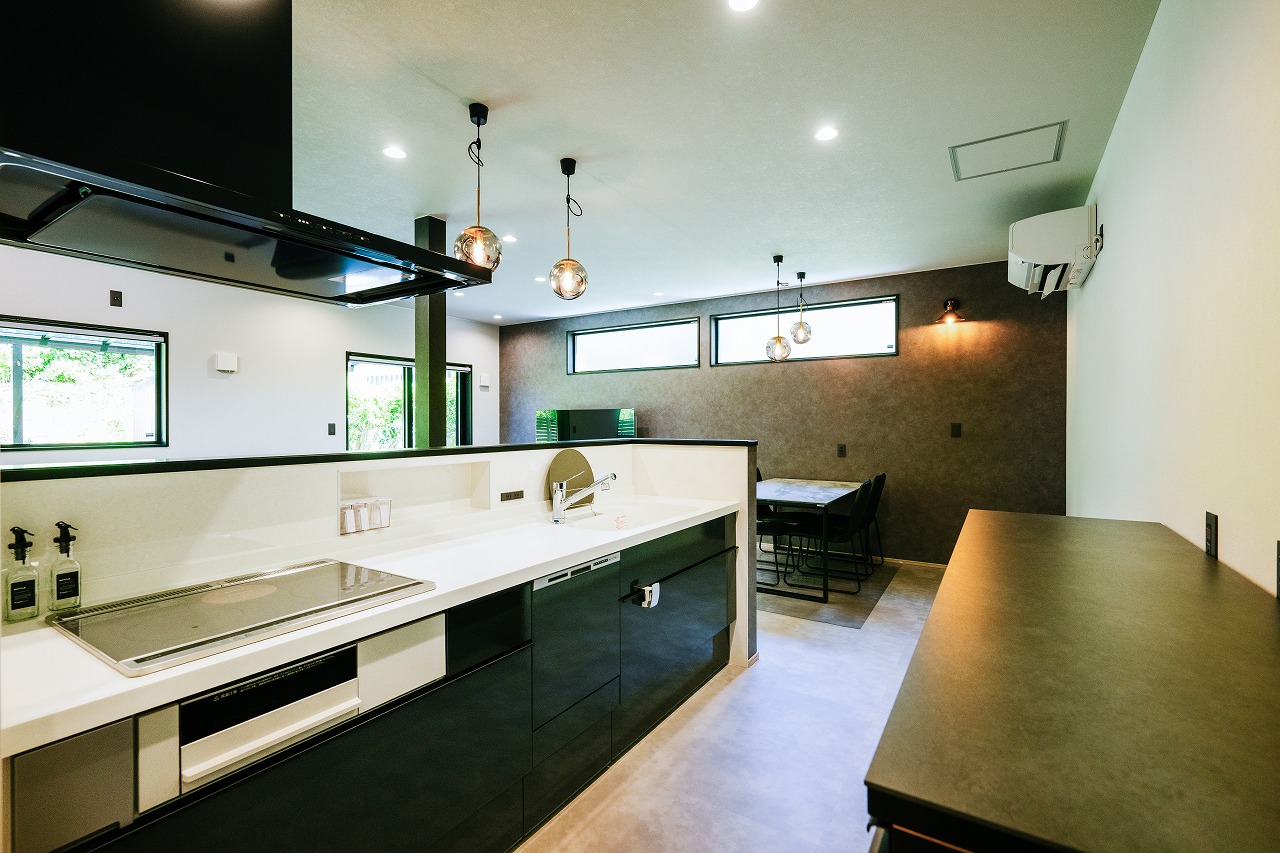 茶色の木目は使わず、どちらかと言えばツヤのあるタイルなどが多いデザインです。