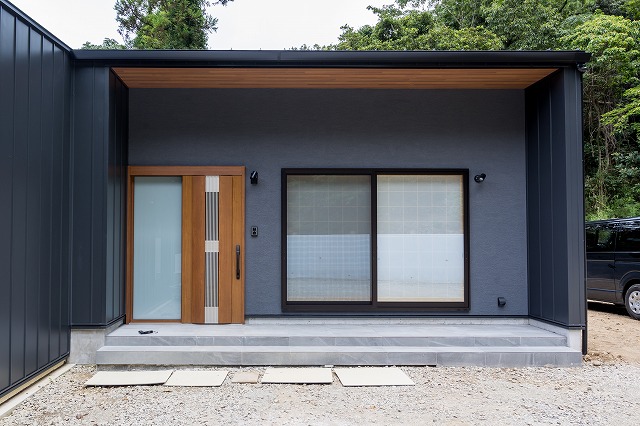 黒い外観と軒天の木目が美しい平屋デザインは、周囲の自然にも溶け込みながら存在感のある佇まいに。