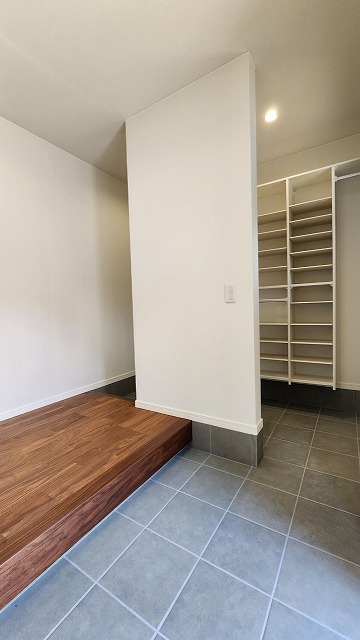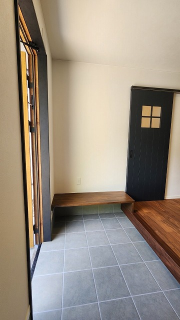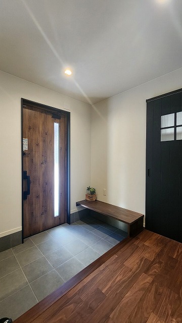 4.5畳の開放的な玄関には、入ってすぐ腰かけられる 造作ベンチ と